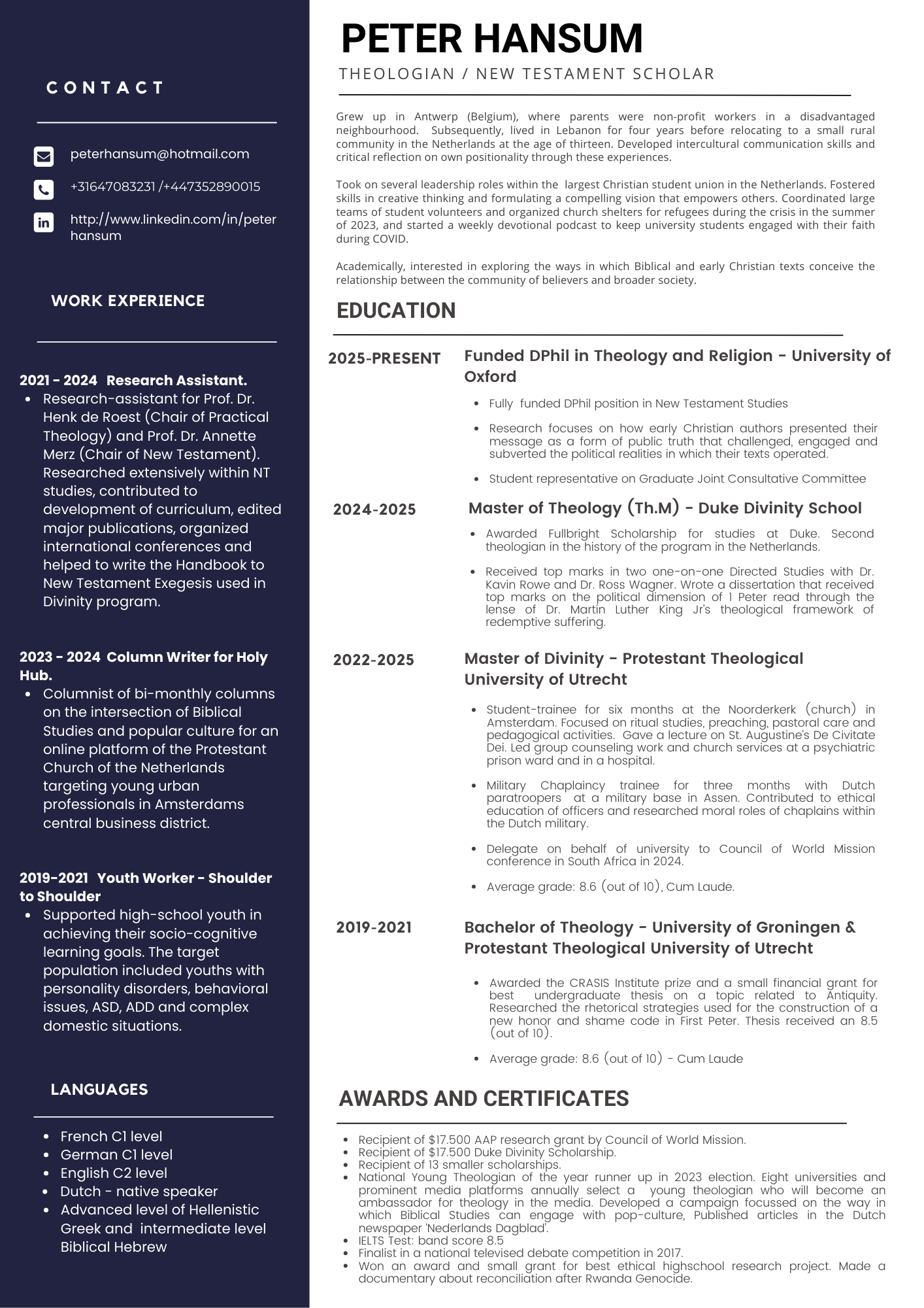 Momenteel is Peter als promovendus verbonden aan de University of Oxford, waar hij als nieuwtestamenticus onderzoek doet naar de politieke dimensie van het Evangelie van Lucas en Handelingen. Voor zijn studie ontving hij een volledige beurs van de Fernside Trust. Peter wordt in zijn onderzoek begeleid door prof. Markus Bockmuehl.